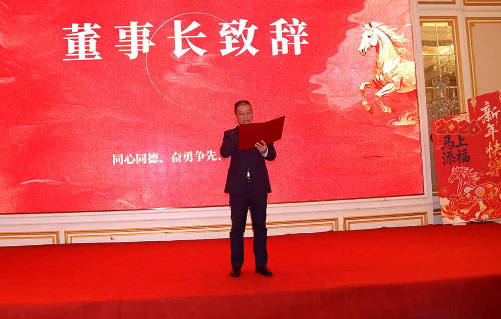 在热烈的掌声中,健恒集团董事长胡子明上台发表致辞。董事长首先向过去一年辛勤付出的全体员工表示了衷心的感谢。全面回顾了2025年集团在复杂市场环境下取得的累累硕果:不锈钢水管逆势增长18%、钛材设备改造完毕马上投入生产、三期项目24000平方米高标准现代化厂房和4000平方米配套宿舍楼顺利竣工以及一系列技术创新成果。展望2026年,董事长号召全体同仁在新的一年里,拿出“开年即奔跑”的干劲,以“马力全开”的拼搏姿态,深耕主业,锐意创新,共同书写健恒集团“钛”产业发展的新篇章。